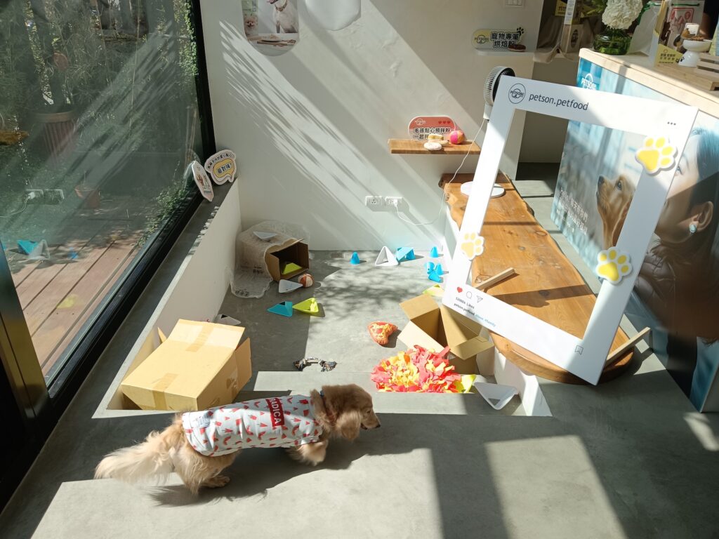 午後的陽光透過落地窗灑進純白空間,毛孩們在角落展開「嗅聞尋寶遊戲」。